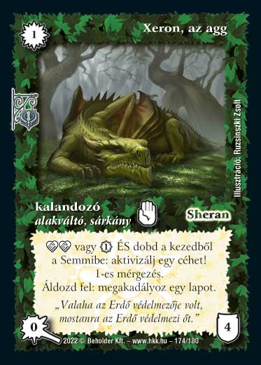 Xeron, az agg már az első olvasáskor feltűnt, hogy nem egy rossz lap, bár akkor azt gondoltam, hogy a kettő köteléket elég nehéz neki összehozni neki. Aztán olvastam az Eldüenen egy sárkány pakli összeállítást, ami ugye rögtön megtermeli a 2 köteléket egy Sárkányfészekkel. S onnantól fogva ez a lap kézből dobásra bármikor képes felállítani egy céhet. Arról ne is beszéljünk, hogyha ez az UR lap képes arra, hogy adja ezt a sárkányt, akkor 2-3 ilyen az asztalon teljesen ellehetetleníti az ellenfelet. Ez mindenképpen figyelemre méltó lap. Saját környezetén kívül persze csökken az ereje, de vajon ki panaszkodna egy asztalról feláldozható lényre, amelyik kánterel?