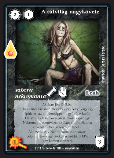 A lap csontváztermelése abban a pakliban kifejezetten jó képesség. S igazából arról sem szabad megfeledkezni, hogy a „K” képessége IS életkioltós. S valóban, ahogy ezt a fórumon jól észrevette valaki, amennyiben megsebzi a lényt (ugye a képessége erre a sebzésre is kiterjed), akkor az a gyűjtőbe kerül. Egy jobb körben 2 lapot old meg ellenfelünk asztaláról. Baross Feri grafikáját mindig is szerettem, nagyon hangulatos lap. Én Rox-ba (Járjjal, vagy Járj nélkül) biztoan kipróbálnám. Szerintem ő is többféle koncepcióban meg tud jelenni, Rox mellett egy zsz-ért és egy nekronért kijátszani több, mint baráti (Járjjal megtámogatva kifejezetten arcátlan). Roxon túl bármilyen Járjas felálással jó lehet.